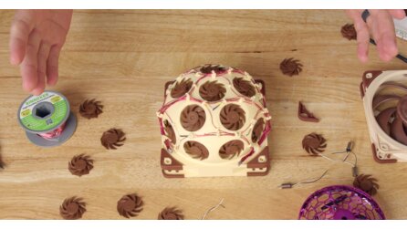 Die Kabelführung war bei gleich 15 Lüftern ebenfalls nicht ganz ohne. Der YouTuber hat sich entschieden, die Kabel an der Oberseite zu verlegen, damit sie im Inneren der Kuppel nicht den Luftstrom behindern.