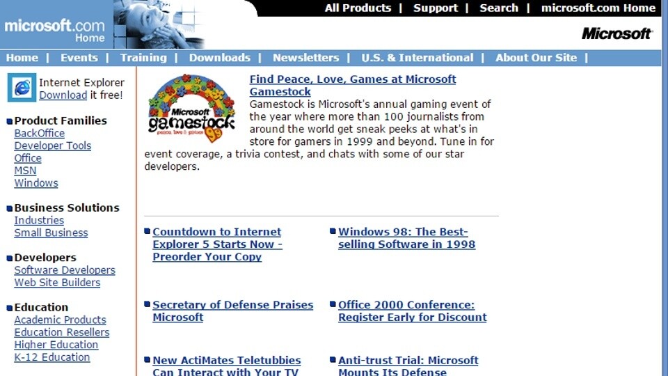 Microsoft hatte bekanntlich die Wichtigkeit des Internets anfangs unterschätzt und sogar verschlafen, einen eigenen Browser zu entwickeln. Die ersten Versionen des Internet Explorer gab es sogar nur in einem kostenpflichtigen Plus-Paket. Dagegen entsprach die Microsoft-Webseite fast von Anfang an den Ansprüchen, die an ein so großes Unternehmen gestellt wurden - auch wenn 1999 der Hinweis auf "Frieden, Liebe und Spiele" für einen Spiele-Medienevent etwas seltsam wirkt. Immerhin wurde auch damals schon über »Killerspiele« diskutiert.