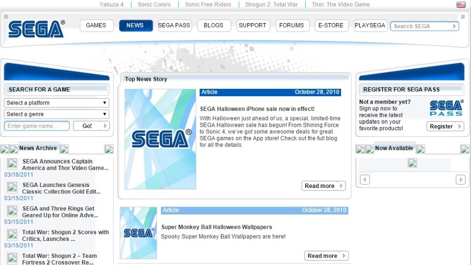 Auch der damalige große Nintendo-Konkurrent Sega war bereits im Jahr 1996 online und wies sogar auf die Möglichkeit hin, das World Wide Web mit einer Sega Saturn nutzen zu können. Das knallbunte Design hielt Sega dann noch bis zum Jahr 2000 durch. Danach und nach dem Ausstieg aus dem Konsolenmarkt wurde die Webseite deutlich seriöser, informativer und vielleicht auch etwas langweiliger. Das aktuelle Design gleicht dem vieler anderer Webseiten wie Nintendo oder EA.