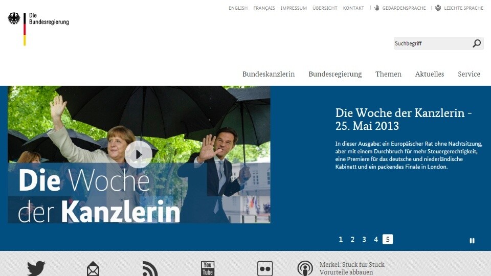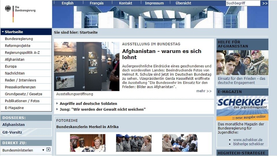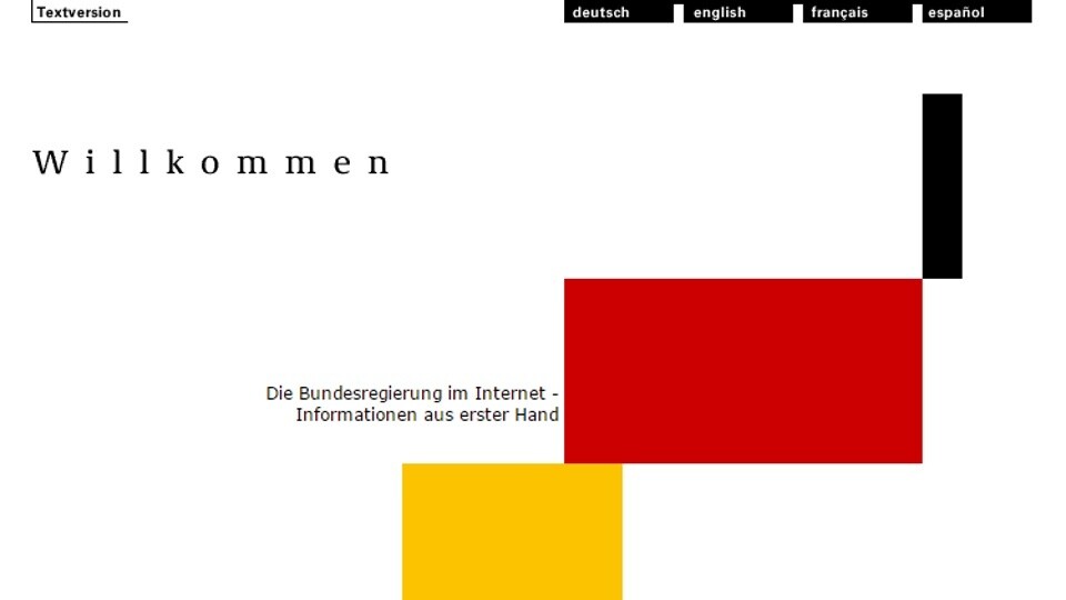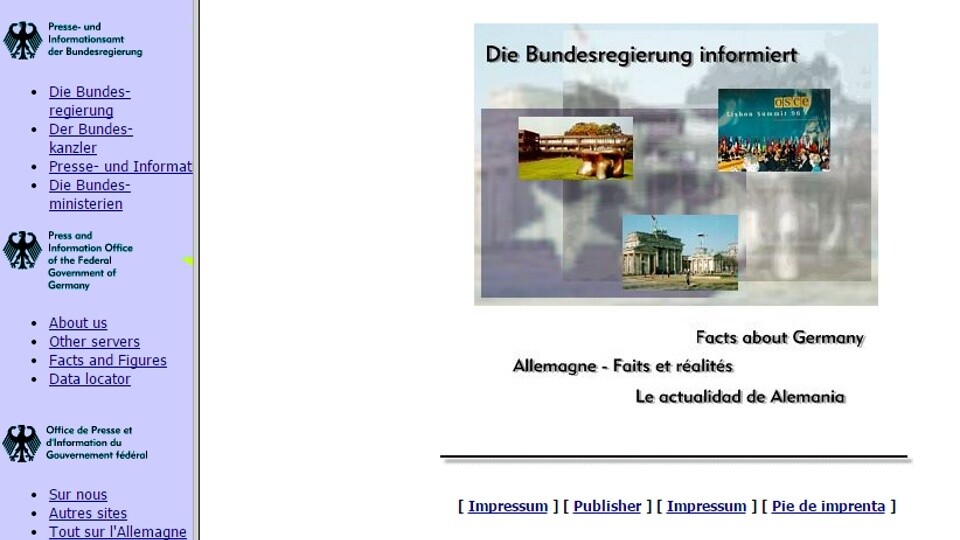 Das Internet ist Neuland für die deutsche Bundesregierung? Mitnichten - denn schon 1996 gab es eine offizielle Webseite, auch wenn deren Inhalt eher an ein Reisebüro als an die Präsenz einer Regierung denken lies. Das änderte sich allerdings recht schnell und aus bundesregierung.de wurde ein Portal mit sehr vielen Informationen und eben so viel PR für die aktuelle Politik der gerade regierenden Parteien, die in der Netzgemeinde bei Themen wie der eben wieder auferstandenen Vorratsdatenspeicherung damals wie heute auf starke Kritik stößt.
