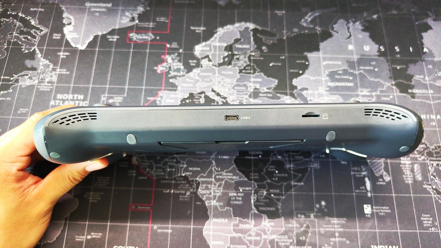 Auf der Rückseite des Zotac Zone findet ihr einen kleinen Kickstand. Der kann effektiv nur in einem einzigen Winkel aufgestellt werden. Wenn ihr ihn nicht weit genug herausklappt, kippt der Handheld um.