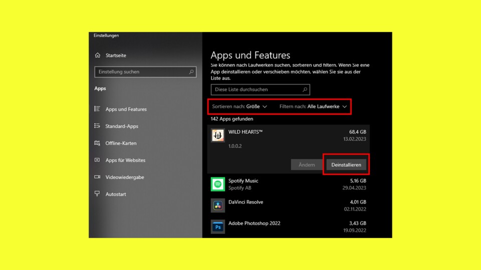 - Klickt auf das Programm oder Spiel, das ihr loswerden wollt und drückt auf »Deinstallieren«