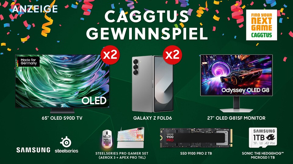 Freut euch auf das Galaxy Z Fold6, den 65" OLED 4K S90D TV, den ultraschnellen 27” Odyssey G81SF OLED Gaming Monitor, die nagelneue SSD 9100 PRO mit 2 TB, die Sonic the Hedgehog™ microSD mit 1 TB und ein hochwertiges Gaming-Setup von SteelSeries.