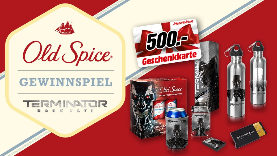 Gemeinsam mit Old Spice verlosen wir zum Kinostart von Terminator: Dark Fate ein tolles Fanpaket. Die Mission? Terminate Sweat! Mit einem Mix aus maskulinem Sandelholz, Lavendel und einem Spritzer Limette findet ihr in der Limited Edition von Old Spice das langanhaltende Whitewater Body Spray und das 2-in-1 Hair und Body Whitewater Shower Gel im Film-Design. Einen Terminator Can Cooler sowie ein Terminator Wallet gibt es ebenfalls dazu. Damit nicht genug beinhaltet das Fanpaket einen riesengroßen MediaMarkt-Gutschein im Wert von 500€.