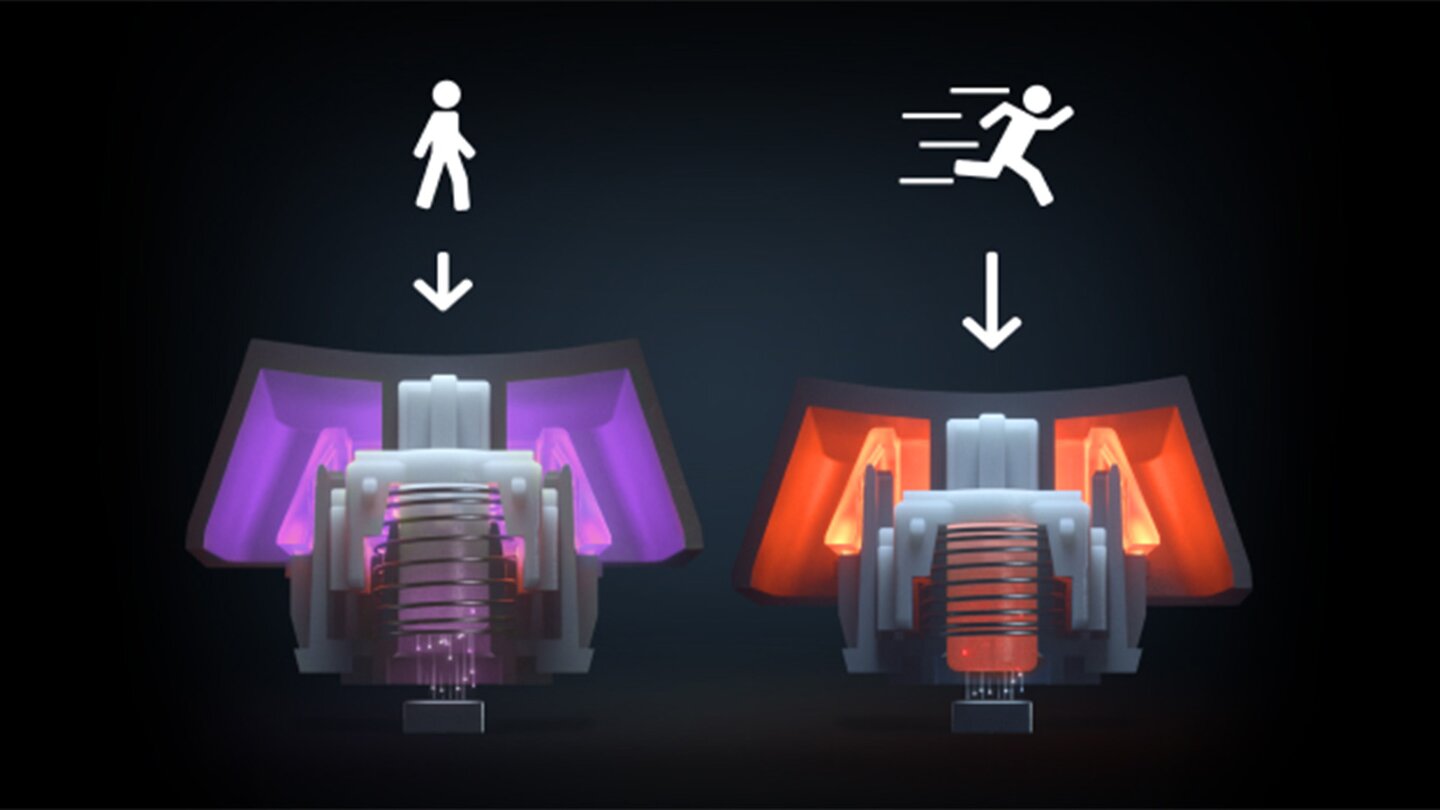 So lassen sich mit dieser Technologie zwei Funktionen auf eine Taste legen und je nach Tiefe eines Tastendrucks nutzen. Ein fast noch größerer Vorteil ist aber, dass der Tastenhub für die Aktivierung unabhängig von der Deaktivierung festgelegt werden kann.